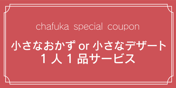 特典内容 | 「チャフカ見ました」と店員さんに伝えると、「小さなおかず」か「小さなデザート」どちらかをサービスいたします。 ※内容はおまかせとなります。 |