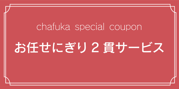 | 特典内容 | 「チャフカ見ました」と店員さんに伝えると、「お任せにぎり2貫」をサービスいたします。 |