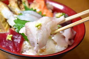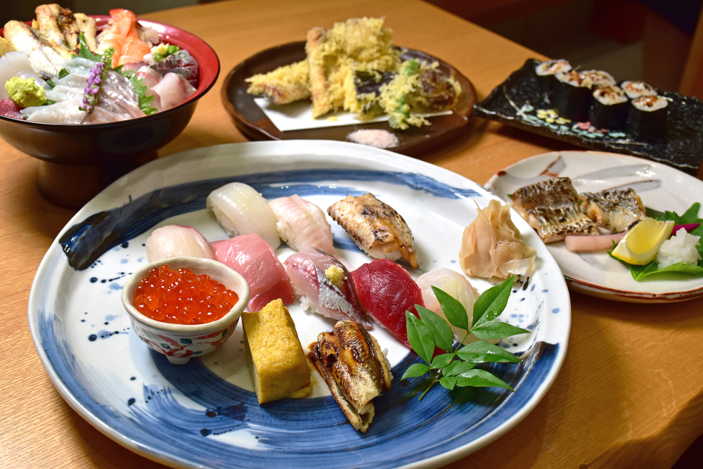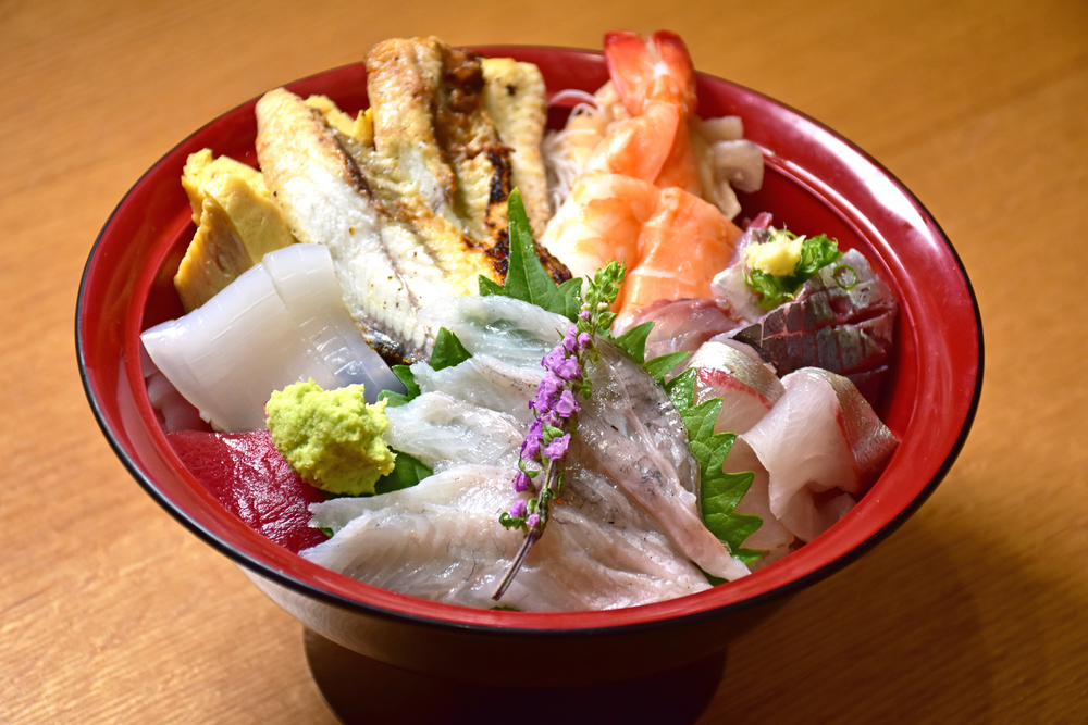 地元の食材にこだわりながらも、その時々の旬の魚を豊洲市場より直送で仕入れております。地魚をふんだんに使った特選にぎり、季節の魚を取り入れた丼ぶりや一品料理まで、その素材が引き立つ調理法で皆様へご提供いたします。また、うなぎ問屋が経営しているので、うなぎ蒲焼はもちろん、その場で焼きあげる新鮮な串焼きもご用意しております。