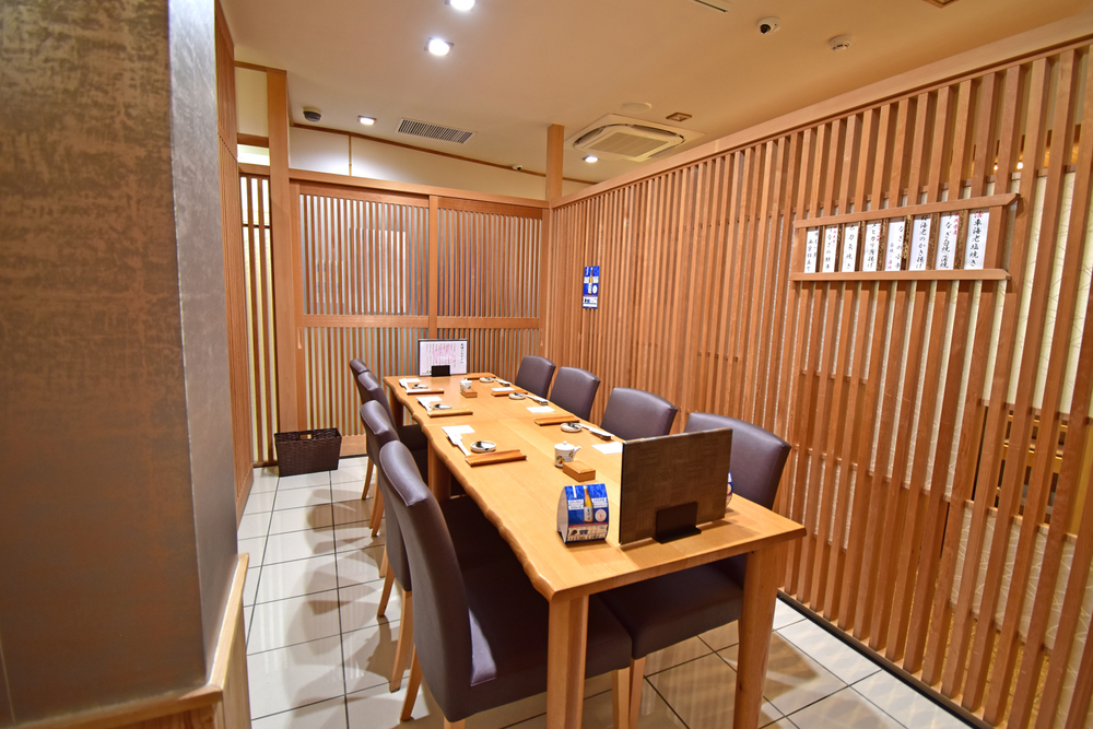 カウンター席のほかは全席個室になっており、ゆっくりくつろげる空間が魅力です。木の温もりを感じる和風の雰囲気の中、接待や各種お祝い事など、周りを気にせずにお過ごしいただけます。