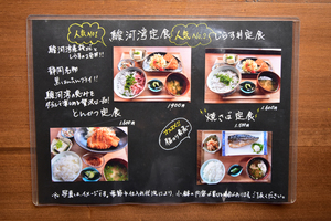 オススメは、駿河湾名物の「桜えび」と「しらす」を贅沢に味わえる「駿河湾定食」です。小鉢は手作りで、地元で採れたて野菜などを使用し、日替わりで提供しています。また、焼きさばやとんかつなどの定番メニューもあり、手作りの温かさを感じられます。