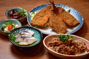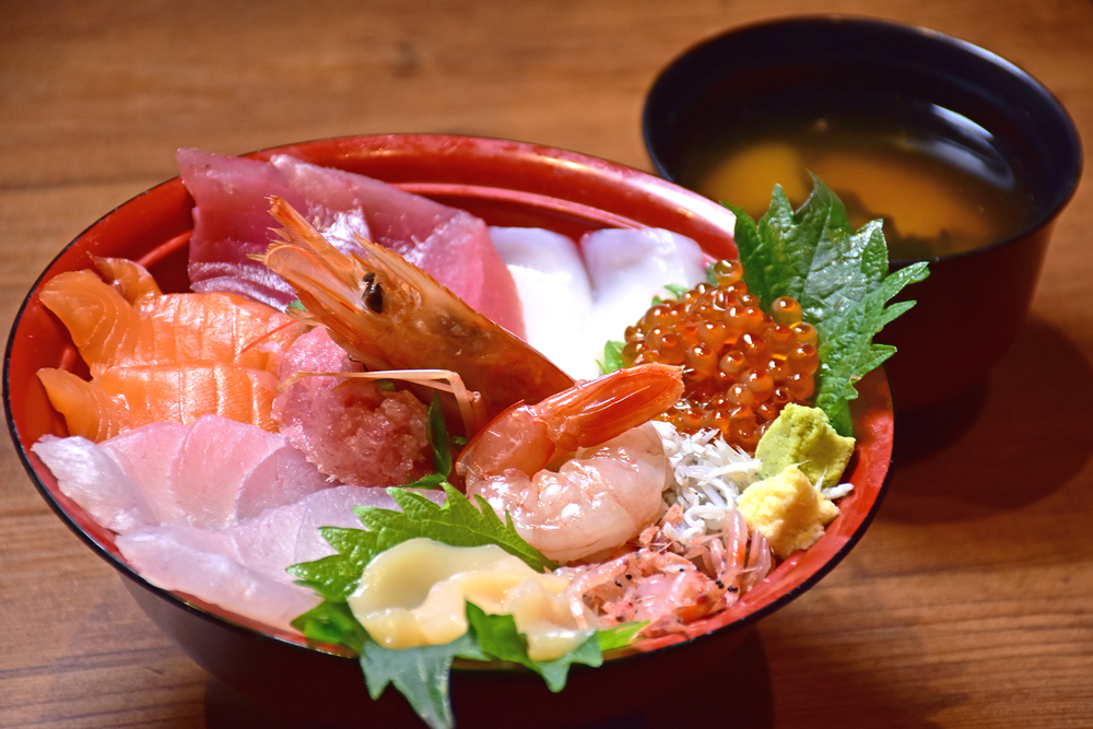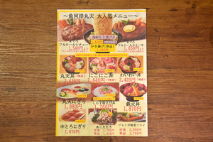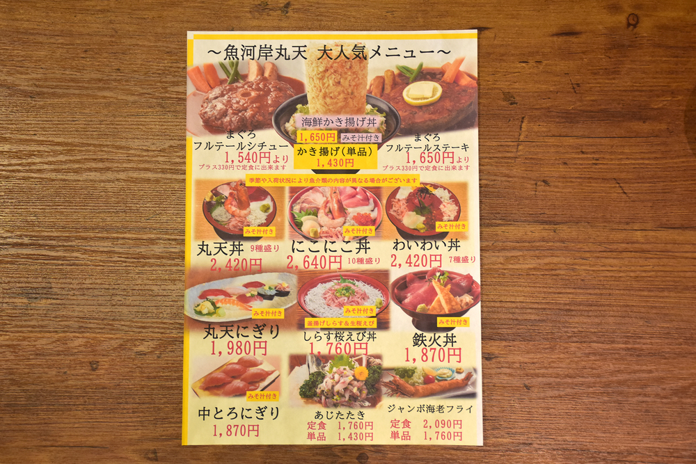 刺身、天ぷら、煮物、茶わん蒸しなど、旬の海鮮や地元の味を少しづつ丁寧に盛り込んだ“小鉢”は、色々なものを少しづつ楽しみたい方にはピッタリ。そのほか、その日届いた魚を取り入れた日替わりメニューや、丸天おなじみの名物かき揚げ丼や海鮮丼もオススメです。