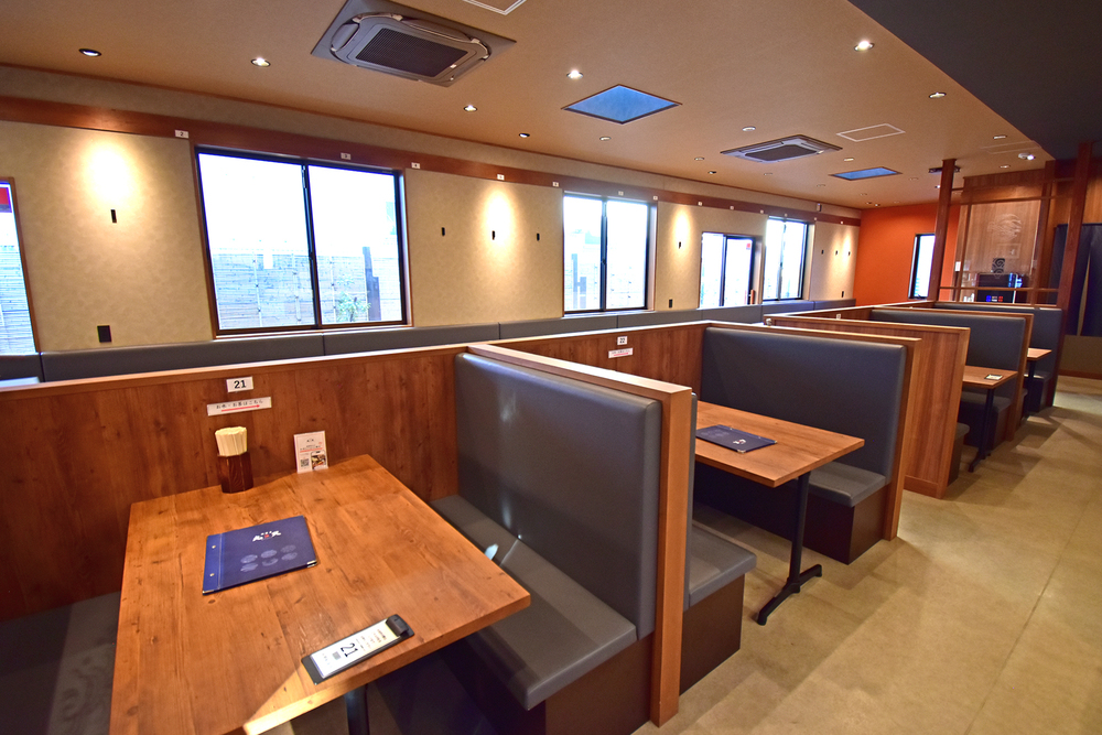 リニューアルしたばかりの綺麗で開放的な店内は、ゆったりお食事を楽しんでいただけるボックス席が中心で、ファミリーでも利用しやすい個室も完備しております。