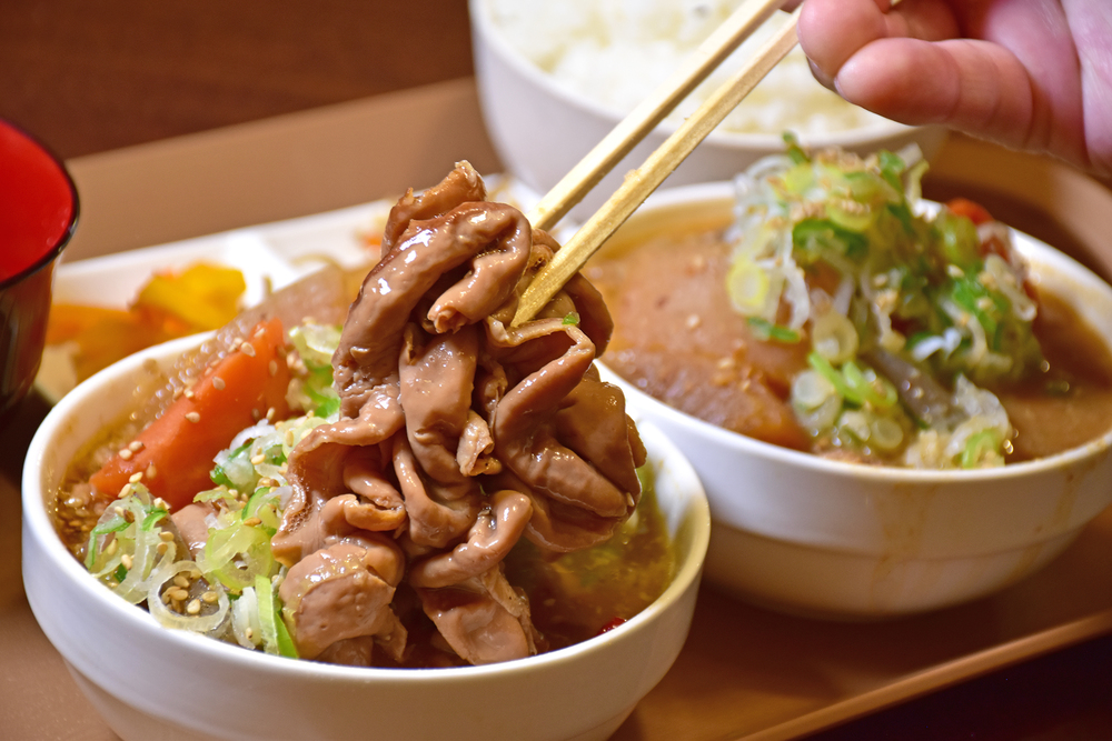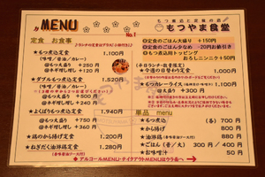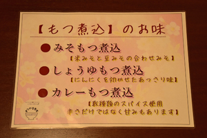 看板メニューは、時間と手間を惜しまず仕込む「もつ煮込み」です。味は、みそ・しょうゆ・カレーの3種類があり、2種類を一度に楽しめるダブルもつ煮込定食が一番人気があります。また、もつの旨みを活かした「もつカレー」や、定食として満足度の高い「唐揚げ」、平日ランチタイム限定の「今週の日替わり定食」なども好評です。