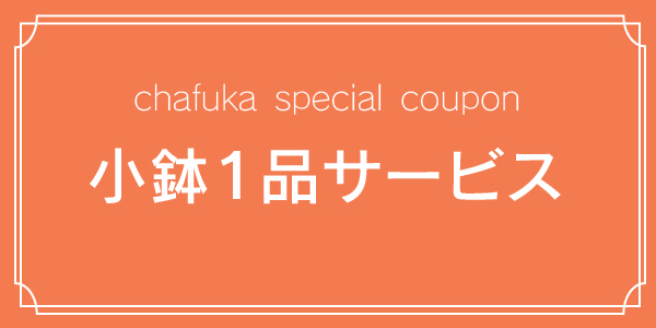 | 特典内容 | 「チャフカ見ました」と店員さんに伝えると、“日替わり小鉢1品”をサービスいたします。 |