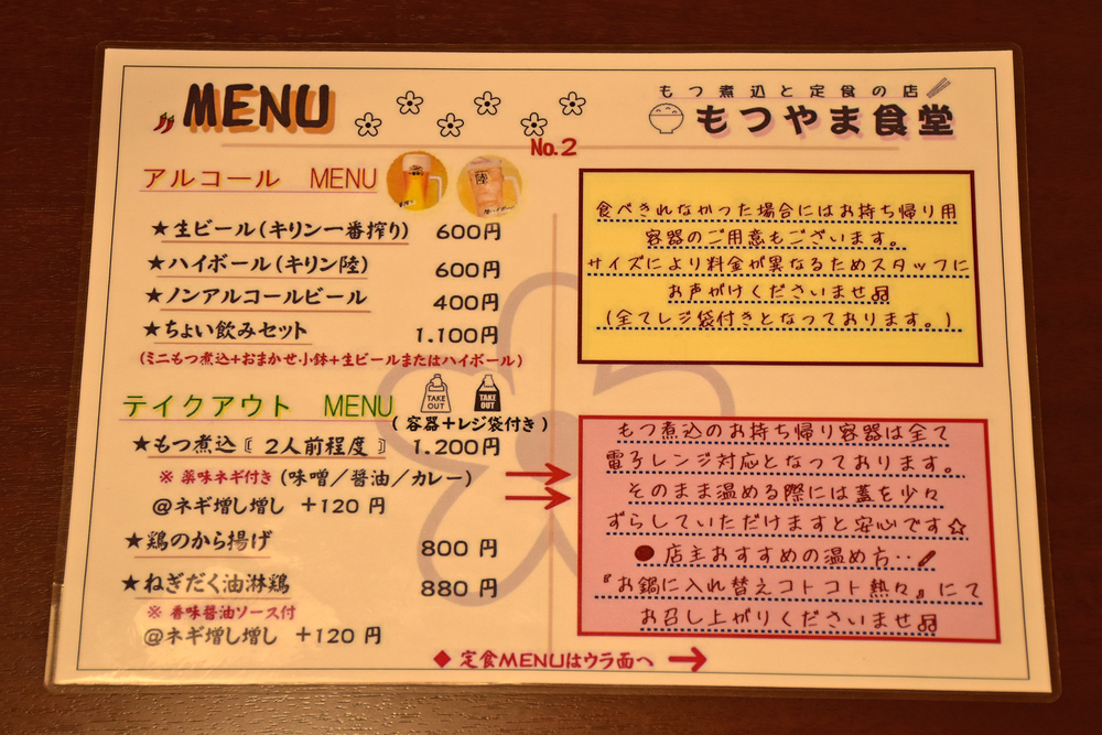 ランチ 11:00~14:00 ディナー 17:30~20:30(オーダーストップ 20:00) もつがなくなり次第終了となります。 |