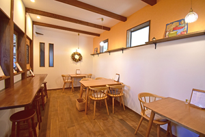 木を基調とした温かみのある空間に、オレンジや黄色のやさしい色合いを取り入れた店内で、どこかほっとするような居心地の良さが魅力です。自然と長居したくなる、やさしい雰囲気に包まれた空間となっています。