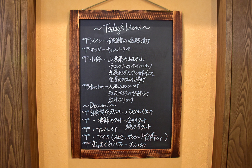 週替わりのランチセットは、小鉢が多く野菜を中心にバランスよく楽しめ、男性の方でもしっかり満足できる内容になっています。塩麹などの調味料もできるだけ手作りにこだわり、素材の美味しさと体へのやさしさを両立したメニューを提供しています。さらに、スイーツはすべて米粉を使用し、タルトやチーズケーキなども一つひとつ丁寧に手作りしています。